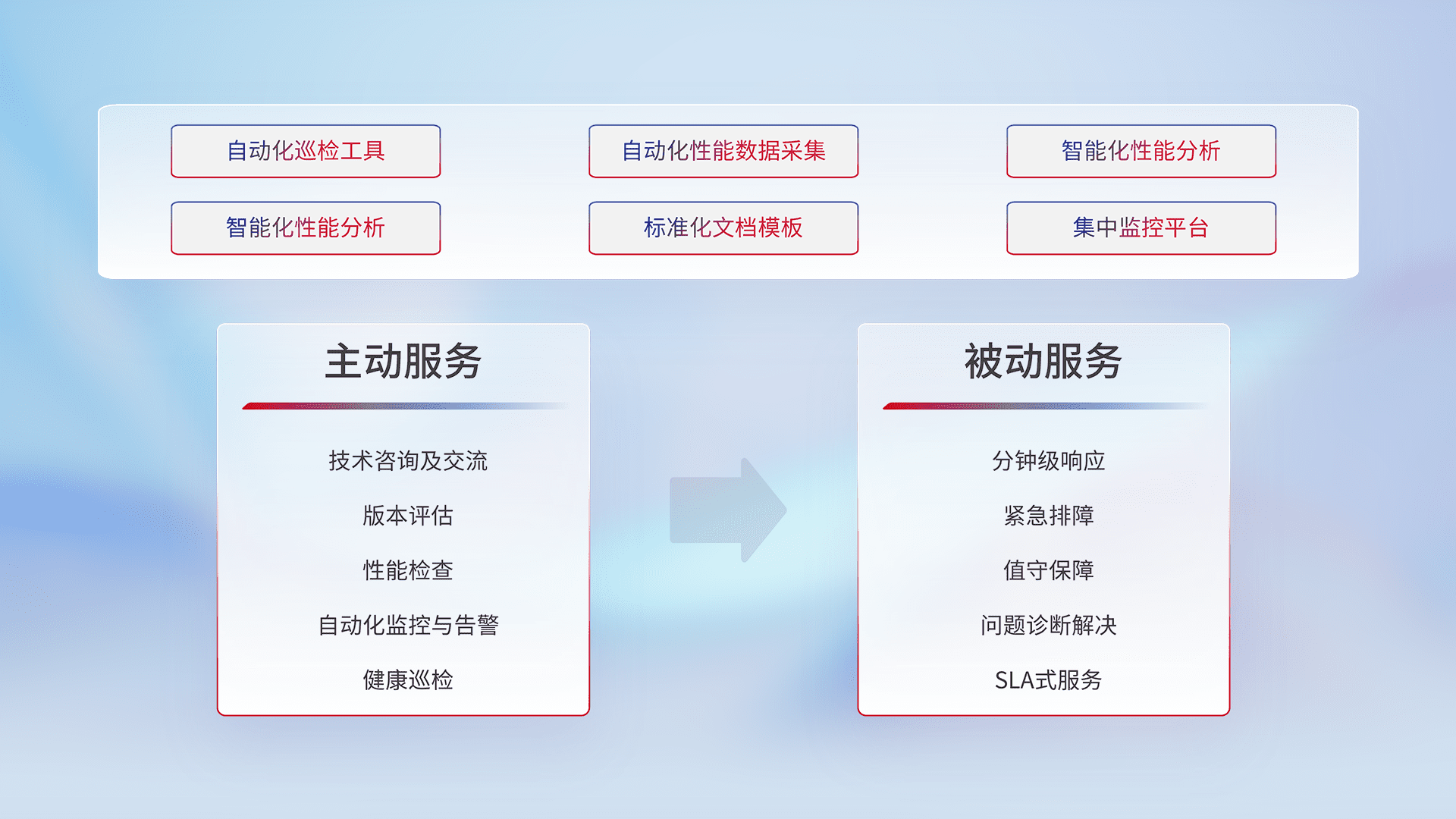 智能化工具和标准化文档,,,,保障服务质量,,,提供主动服务(包含技术咨询、、、版本评估、、、性能检查、、、、自动化监控与告警、、、、健康巡检)和被动服务包含(分钟级响应、、、紧急排障、、值守保障、、、问题诊断解决、、、、SLA服务)。。